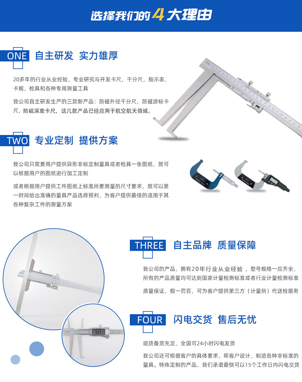 天津桂量量具刃具有限公司,擁有20年的行業從業經驗,主要生產游標卡尺卡尺,數顯卡尺,帶表卡尺,各種千分尺,百分表,內徑百分表,高度游標卡尺,深度卡尺,卡規,檢具和各種測量工具,是一家集設計生產,銷售為一體的企業。 我公司開發生產了三款新產品:防磁外徑千分尺,防磁游標卡尺,防磁深度卡尺,這幾…